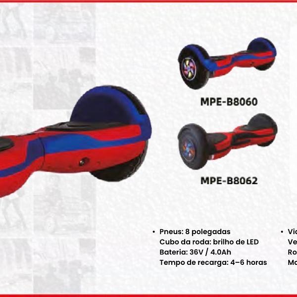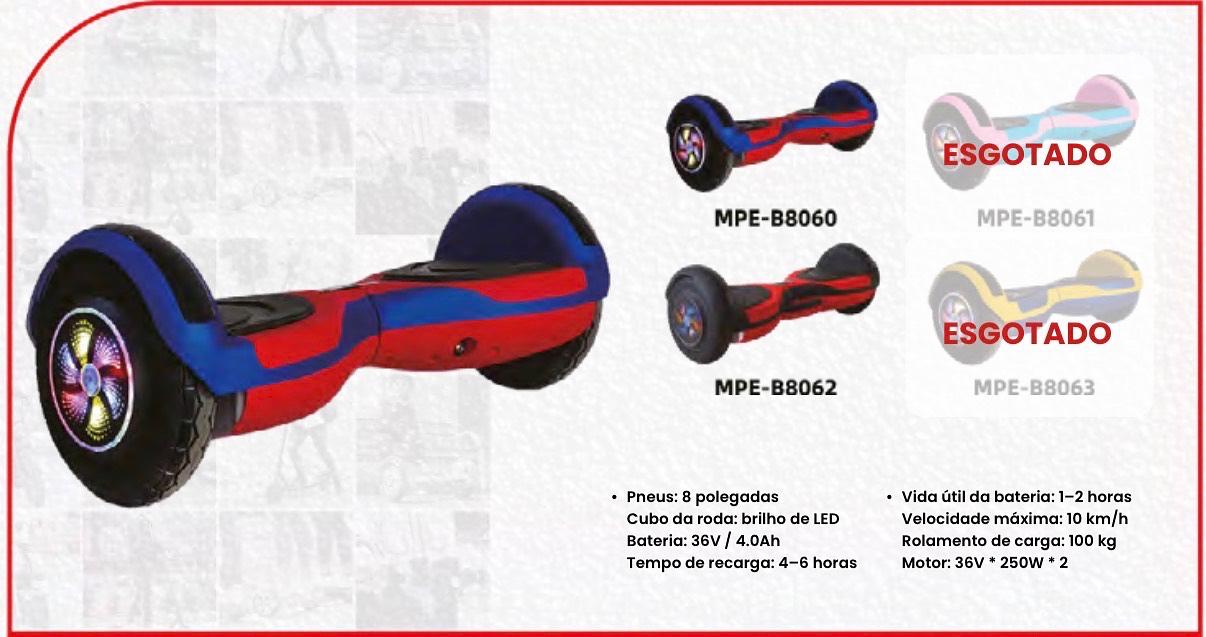 Pneus: 8 polegadas Cubo da roda: brilho de LED Bateria: 36V / 4.0Ah Tempo de recarga: 4-6 horas • Vida útil da bateria: 1-2 horas Velocidade máxima: 10 km/h Rolamento de carga: 100 kg Motor: 36V * 250W * 2
