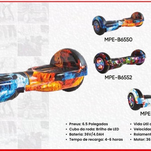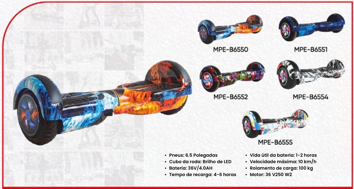 • Pneus: 6.5 Polegadas • Cubo da roda: Brilho de LED • Bateria: 36V/4.0AH • Tempo de recarga: 4-6 horas MPE-B6555 • Vida útil da bateria: 1-2 horas • Velocidade máxima: 10 km/h • Rolamento de carga: 100 kg • Motor: 36 V250 W2