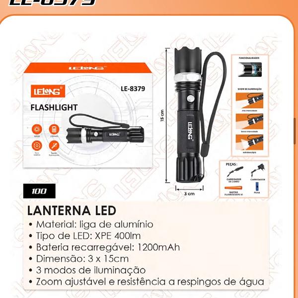 LANTERNA LED • Material: liga de alumínio • Tipo de LED: XPE 400lm • Bateria recarregável: 1200mAh