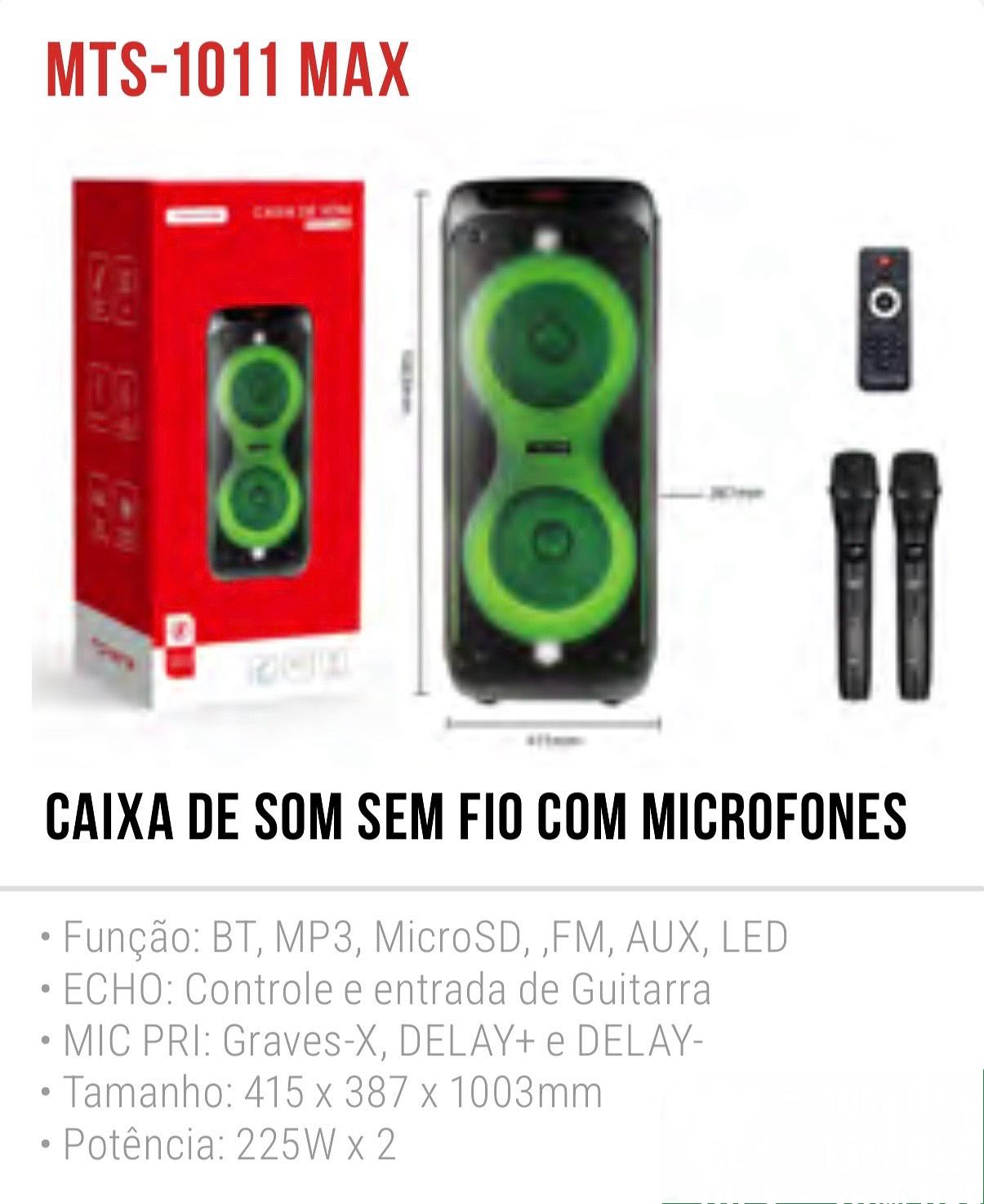 CAIXA DE SOM SEM FIO COM MICROFONES • Tamanho: 415 x 387 x 1003mm • Potência: 225W x 2