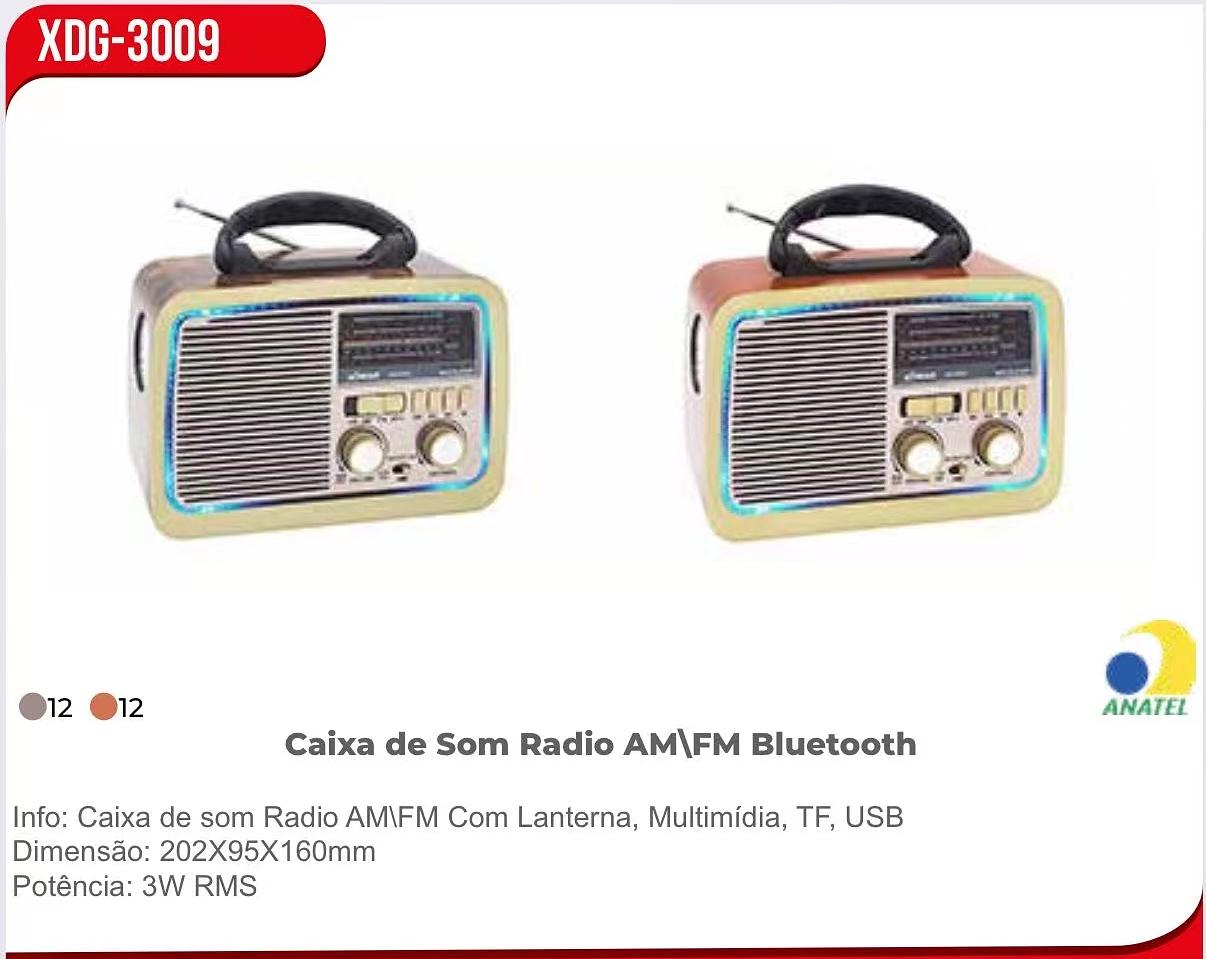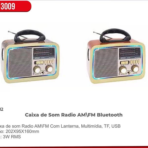 Info: Caixa de som Radio AMIFM Com Lanterna, Multimídia, TF, USB Dimensão: 202X95X160mm Potência: 3W RMS